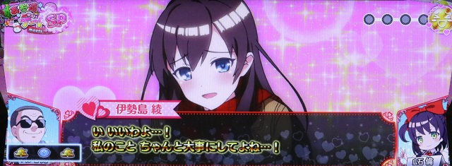 前兆演出のデートで相手が伊勢島 綾の場合、「い、いいわよ…! 私のことちゃんと大事にしてよね…!」と言ってくれれば大当りよ。