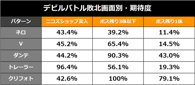 デビルバトル敗北時にトレーラー画面が出て、その後ニコズショップに行かなかった場合は「残りボス1体確定=1体倒せばAT当選」なので勝負続行がオススメ。