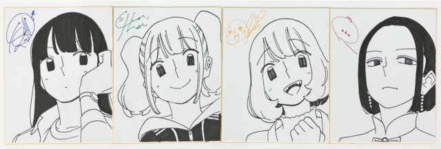 ぱちん娘。の作者である若林先生直筆イラストに、それぞれのキャラを演じた声優、芹澤優さん、田中美海さん、加隈亜衣さん、上田麗奈さんのそれぞれのサインが入った色紙が計4枚。