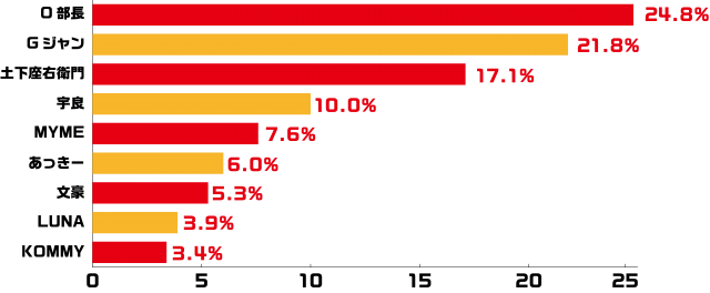 当初は私文豪が本命の◎をビシッと打って見守っていたGジャンが素晴らしいスタートで飛び出したんですが、気づけばO部長が先頭に躍り出て、そのまま差を広げつつ最終的には独走でフィニッシュ。ぶっちぎりのクビ確定と相成りました。票の獲得割合は下のグラフの通り。
