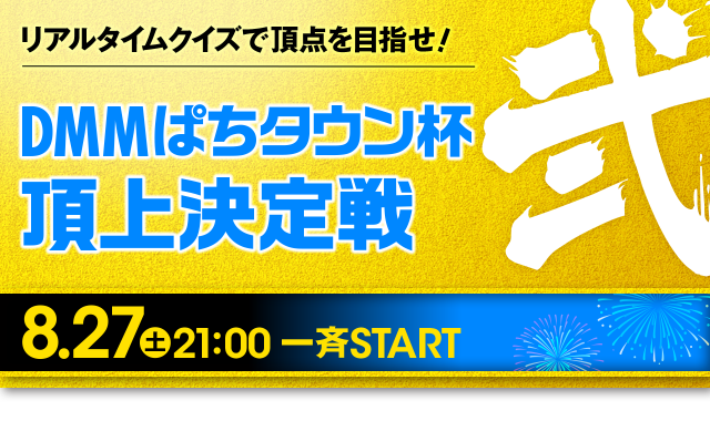 いよいよやってきました。全国一斉のライブクイズで頂点を決める「DMMぱちタウン杯 頂上決定戦」! こちらも「前哨戦」同様のレギュレーションでスコアを競います。スコアに関わってくるのは、下記の2つ。
