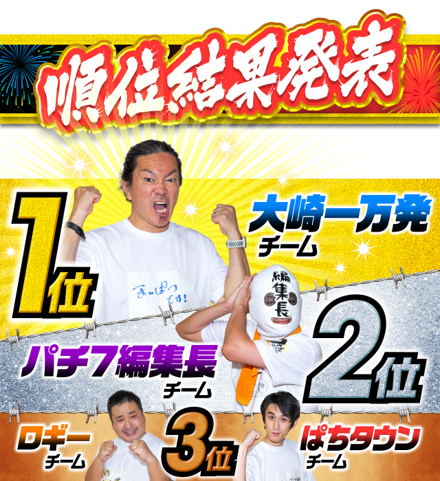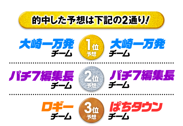 3位は同率で「ロギーチーム」、「ぱちタウンチーム」の2チームなので、順位予想キャンペーンの結果は以下のとおりになりました。