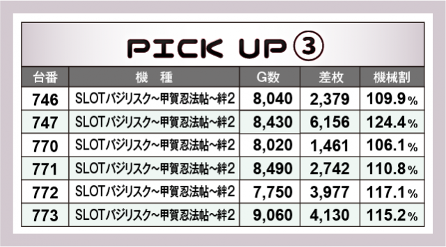 まず初めに優秀30台の紹介から。30台中全てが+2,000枚オーバーとなり、+3,000枚オーバーが15台、+5,000枚オーバーが7台となった。この日のトップ差枚数を獲得したのは、747番台の『SLOTバジリスク~甲賀忍法帖~絆2』で、+6,156枚のハイスコアを記録した。後述するピックアップ機種以外では、650番台の『パチスロアラジンAクラシック』が+5,712枚、702番台の『パチスロ北斗の拳宿命』が+5,596枚、さらに672番台の『沖ドキ!DUO-30』が+5,025枚となり、様々な機種が大台を突破する形となった。
