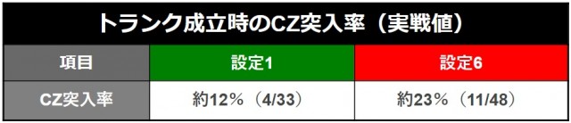 実戦上、設定6のCZ突入期待度はトランク成立時の約23%(4~5回に1回)で、設定1と比べると突入率に約2倍の差があります。