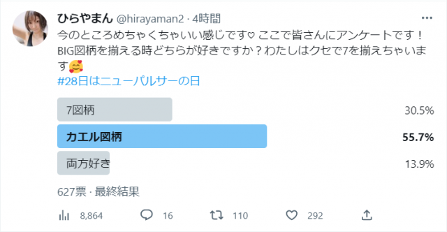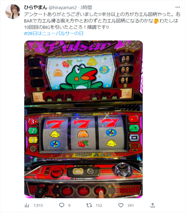 途中でTwitterをご覧の皆さんに「BIGを揃えるならどの図柄?」というアンケートを実施。ヒラヤマンはついつい7で揃えちゃうとのことでしたが、Twitter読者の投票集計は「カエル図柄」が全体の6割弱という結果に。「ニューパル」と言えば、やっぱりキュートなこの図柄ですよね~。