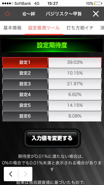 ユニメモ頼りにぱちタウンアプリで判別すると、まぁそうだよねといった結果に。周りの状況を見ても6挙動の台がすでに数台かあるのを確認してるし、6狙いだったこともありヤメ。