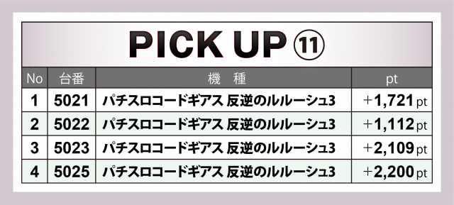 こちらも勝率は約7割で、5機種の中で目立ったのは『パチスロ頭文字D』『パチスロコードギアス 反逆のルルーシュ3』の各4台ずつ。全台がプラスを成し遂げ、後者では全台4桁のポイント数となる高水準でフィニッシュした。