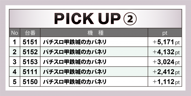 何と言っても注目は、+1万ptを突破した5155番台。さらに続いた5105番台も+5千超のポイント数を残した。