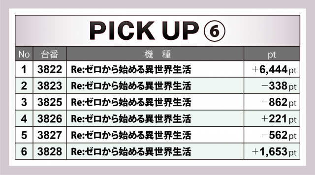 勝率は7割超、最も高いポイント数となったのは+6千pt超を残した『Re:ゼロから始める異世界生活』。さらに『パチスロこの素晴らしい世界に祝福を!』『SLOTとある科学の超電磁砲』の2機種が+3千超となるポイントを記録した。
