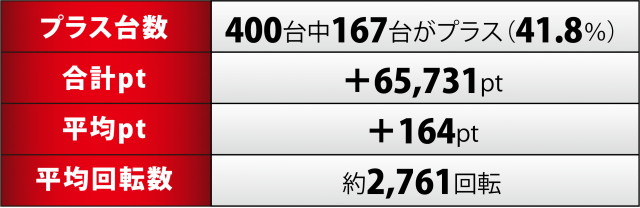 前月の調査時と同じく、今回も日曜日&「3のつく日」に該当した。一般的には厳しいホール状況と言われる週末の営業ながら、多くの台が実力を発揮し、[1000円/46枚]スロ全400台の合計は前回の合計ptを上回る+6万5千超を達成した。以下から、特に好調だった機種や並びについての詳細データを追って解説していこう。