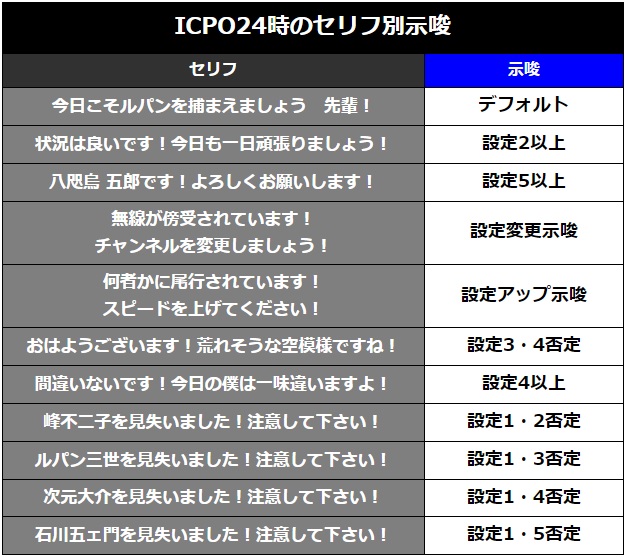 AT終了後に「ICPO24時演出」が発生すると、セリフの内容で設定が示唆されるから見逃し厳禁。遊技している時間帯によって、発生する内容が変化するみたいだから注目してね♪