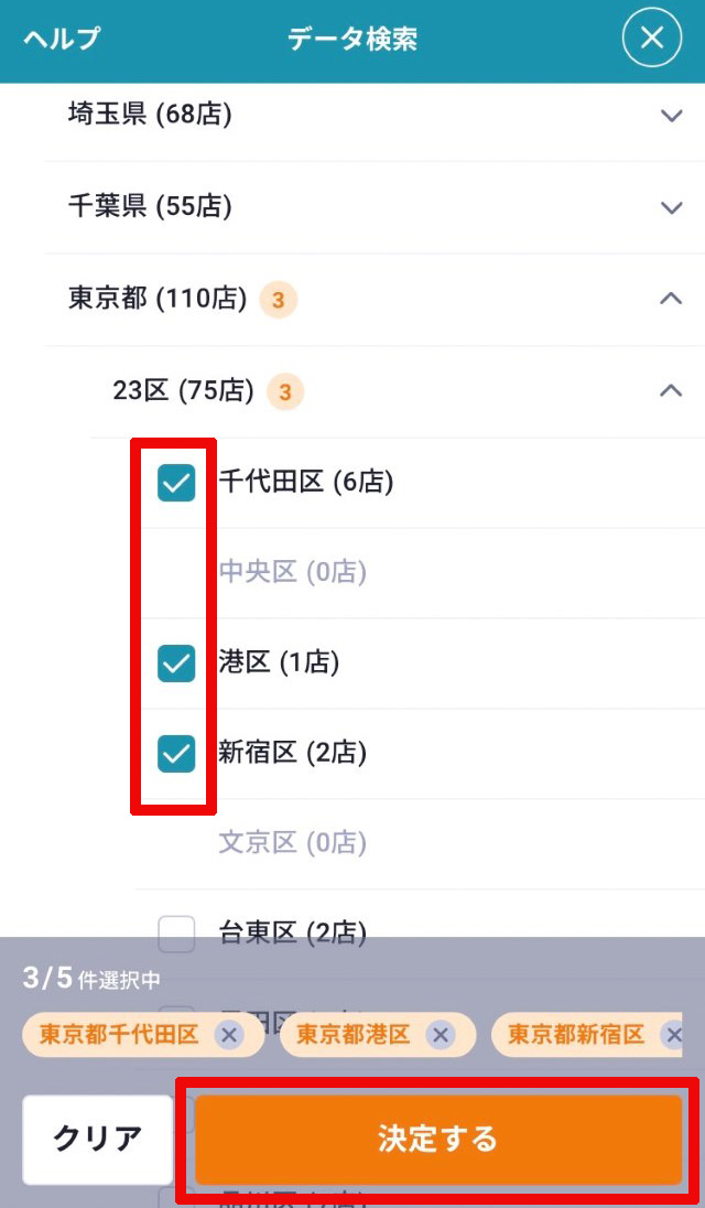 手順②:エリア一覧から検索したいエリアにチェックを入れ「決定する」を押す