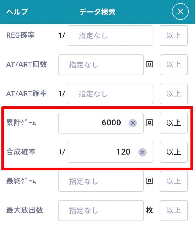 ・総ゲーム数6000G以上、合成確率1/120以上の台だけを検索したい場合