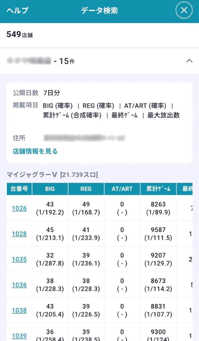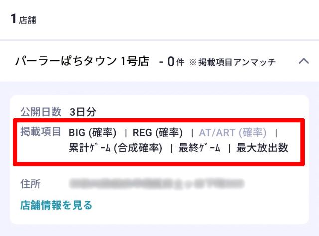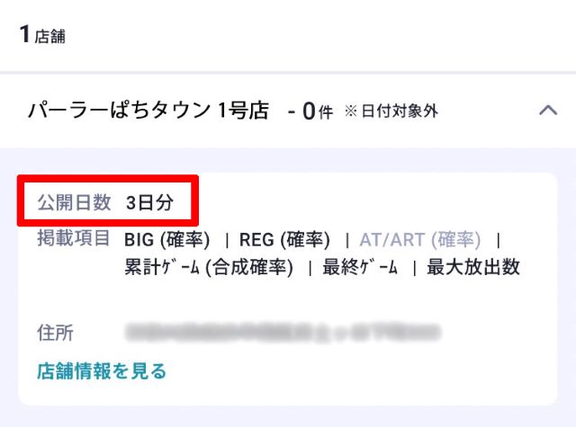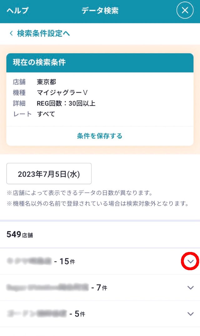 各店舗の詳細が知りたい場合は、店舗名の右にある「v」を押すと台情報を確認することができます。