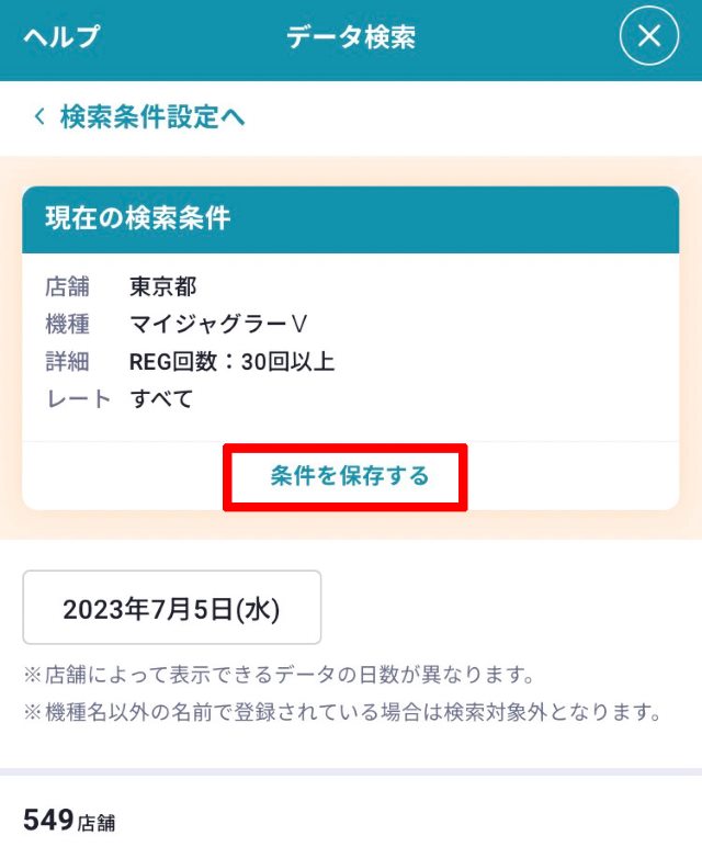 毎回検索条件を入力するのが億劫な方は、検索結果画面の赤囲み部分の「条件を保存する」を押すと、現在の検索条件を保存することができます。
