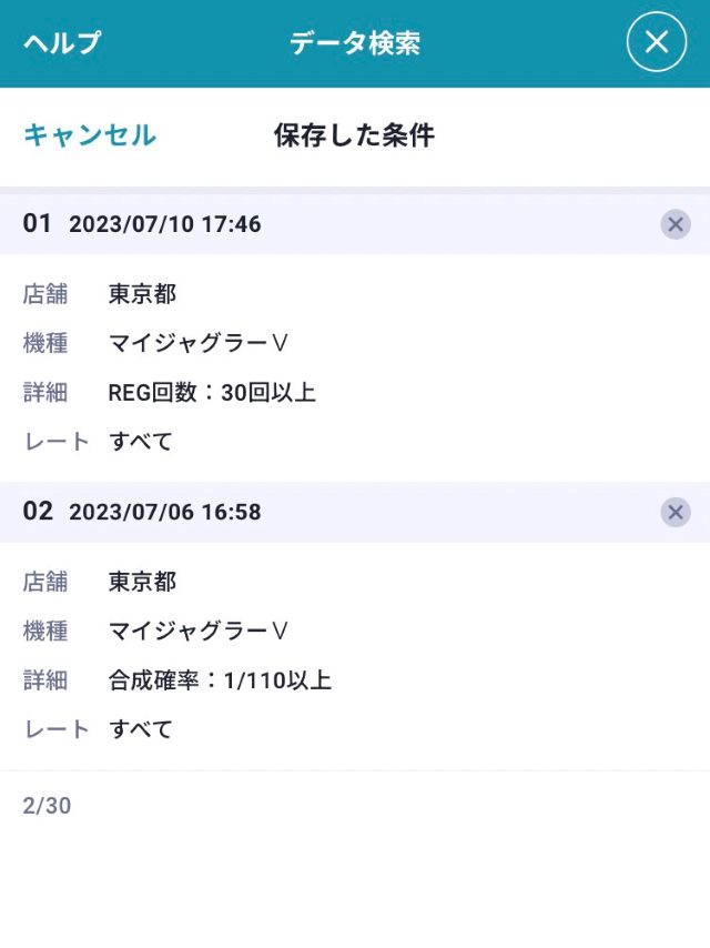 保存した検索条件はデータ検索TOP画面右上の「保存した検索条件」から呼び出すことができるようになり、最大30件まで保存することができます。