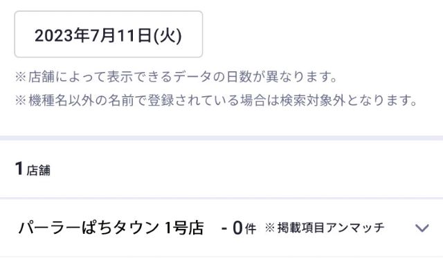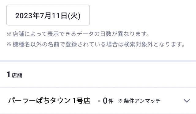A:条件を満たしていない、もしくは検索した機種が設置されていない場合は「※条件アンマッチ」と表示されます。再度、詳細条件や機種を変更してお試しください。