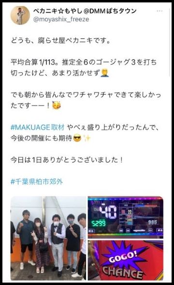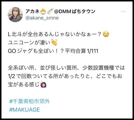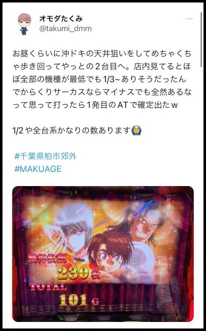 「どの機種にもチャンスありの状態だったんで、抽選ゲーにならずユーザー的には間違いなく1番期待できる内容だったと思う。500番入場の人がなんとか座れた台が6なんてこともあったわけで、昨日は恐らく最低でも1/3以上で高設定だったと思うんで、ユーザー全員が1/3以上のくじ引きしてるイメージ。それと2台構成以上は恐らく全機種に高設定入ってたんじゃないか。MAKUAGE素晴らしかったです。」
