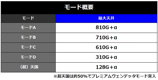 天井ゲーム数は、(超)天国=128G、モードA=810G、モードB=710G、モードC=610G、モードD=310Gの全5種類。
