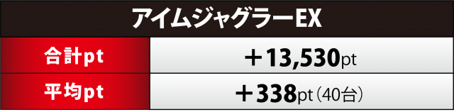 5桁を超える合計ptを残したのが『アイムジャグ』40台。プラス率は45%(18台)と半数を切ってしまったが、シマトップの890番台による+3千8百弱を筆頭に、1,000overは16台&+2千超が6台と、数々の優良台をカウントすることができた。