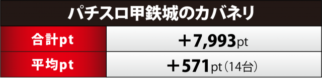 『カバネリ』14台も+8千到達目前の合計ptでプラスを獲得。プラス台の割合は約43%(6台)とこちらも全体の半数には及ばなかったがその全てが1,000overに達した。また、コーナー首位となった1018番台が+7千2百超を記録、その他でも+3千超と+2千超が2台ずつと、プラス台とマイナス台のメリハリが効いた結果となった。