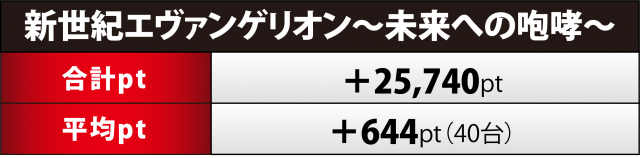40台と同店最多設置となる『エヴァ15』は+2万6千弱の数値でフィニッシュ。プラス率は40%(16台)と半数には届かなかったものの、プラス5桁は12台、トップの162番台が+3万9千弱を弾き出したのを始めに他にも+3万オーバー×2、+2万オーバー×3と、大量出玉台が重なった。