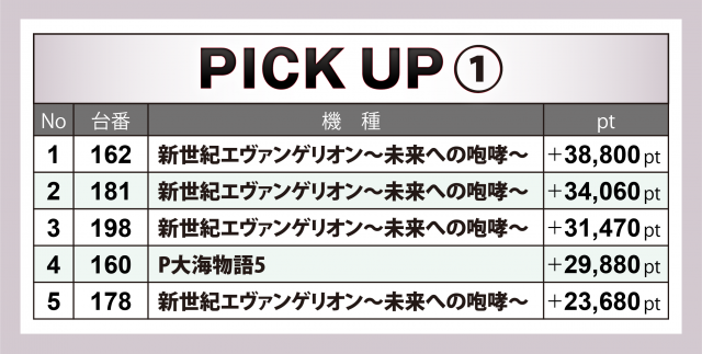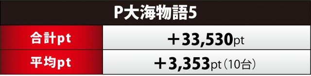 『大海5』10台は+3万4千弱の合計ptにより平均ptでは『エヴァ15』を上回った。5台がプラスでその割合は50%と半数に至り、後ほど挙げる4機種によるトップ5に160番台がほぼ+3万の差玉で4位入賞を果たした。