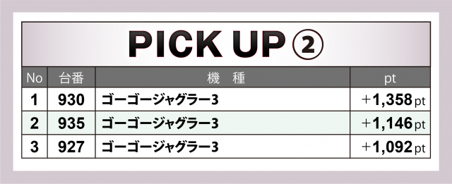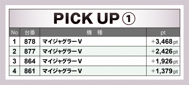 機種トータルでプラスを逃した『マイジャグ』20台。上表に挙げた4台がプラスとなり、全体に占める割合は20%と低さは否めなかったが、最優秀となった878番台が+3千5百弱で気を吐いた。