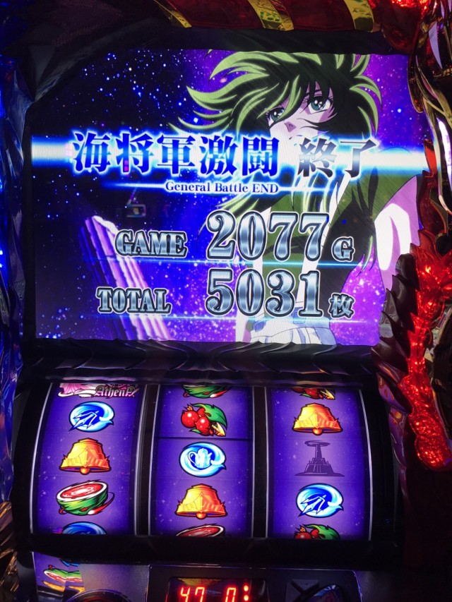 設定推測としては、先ほど話した聖闘士ラッシュ直撃・早いゲーム数での当選・コスモポイントからの海将軍バトル当選回数を見ると【テッペン】だと思うのですが、海将軍バトル中・後の画面での設定示唆、聖闘士ラッシュ後の画面での設定示唆は奇数寄りだったので5かなとも思いました。