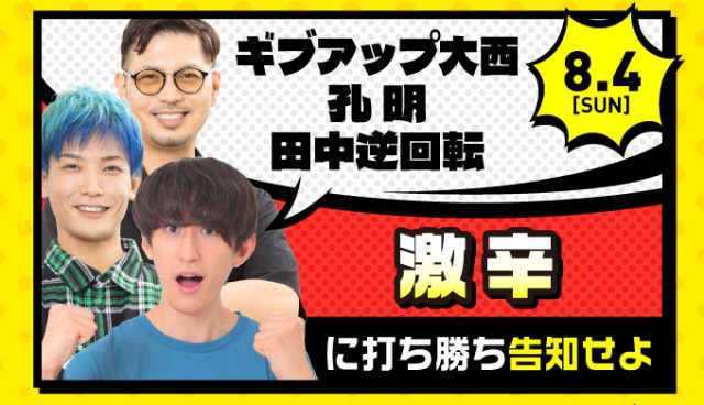 8月4日(日)は、ギブアップ大西(@giveup_onishi_8)・孔明(@koumei_0910)・田中逆回転(@TKgyakukaiten)の3人が極激辛のカップ焼きそばを食べて、辛さに耐えながら告知するという内容。頑張って。