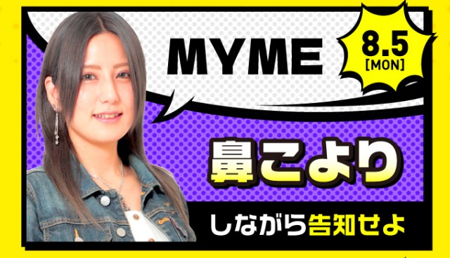 8月5日(月)はMYME(@MYME1202)の出番です。鼻こよりをしながら、くしゃみを我慢して告知を行います。なかなかタレントがくしゃみをする姿は見られないので、くしゃみしちゃっても我慢できても楽しめそう?