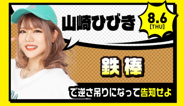 8月6日(火)は山崎ひびき(@ymzk_hbk)が登場。内容は、鉄棒で逆さ吊りになって告知するというものです。どんな衣装でチャレンジしてくれるんでしょうか。