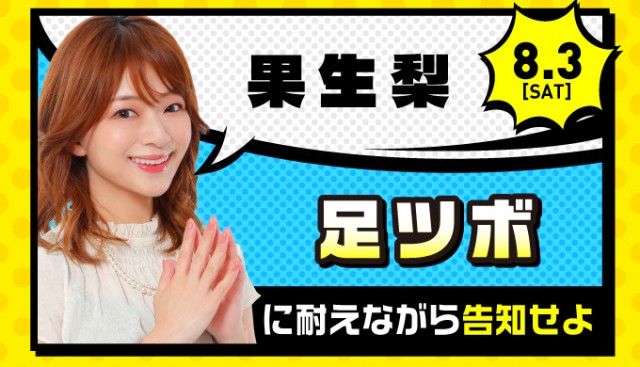 8月3日(土)の担当は果生梨(@kaotibeam0518)。足つぼを押される痛みに耐えながら告知をします。痛みに耐えてよく頑張った姿を見て感動しちゃいましょう。