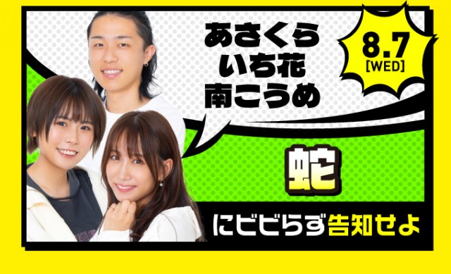 8月7日(水)の最終日は、あさくら(@asakura_tezza)・いち花(@ichika_pachi8)・南こうめ(@koume_dmm)の3人が挑戦。全員で大蛇を首に巻いて最後の告知。ビビることなくできるかどうかが見どころです。