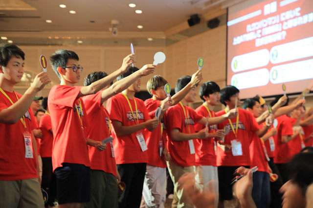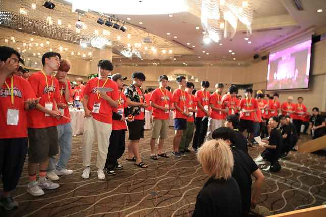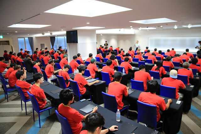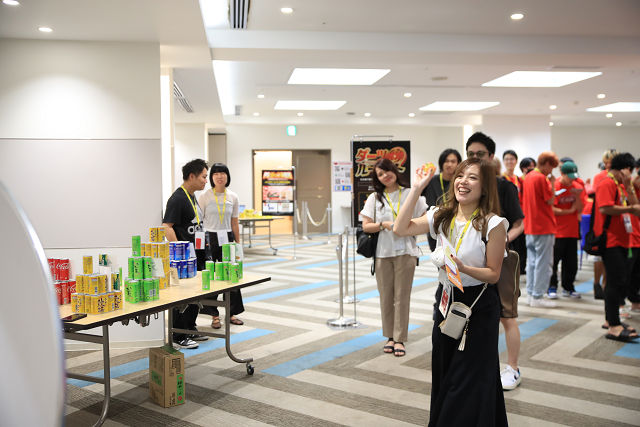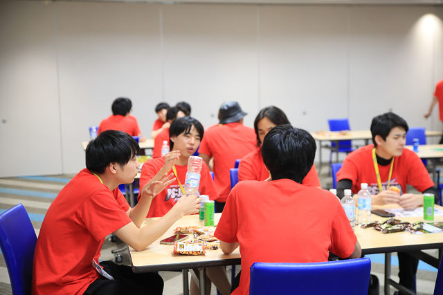 静寂に包まれた知識テストの後はお楽しみの学生レクリエーション。応援サポーターや協賛企業の方も参加され、お菓子やジュースでモグモグタイム!