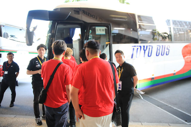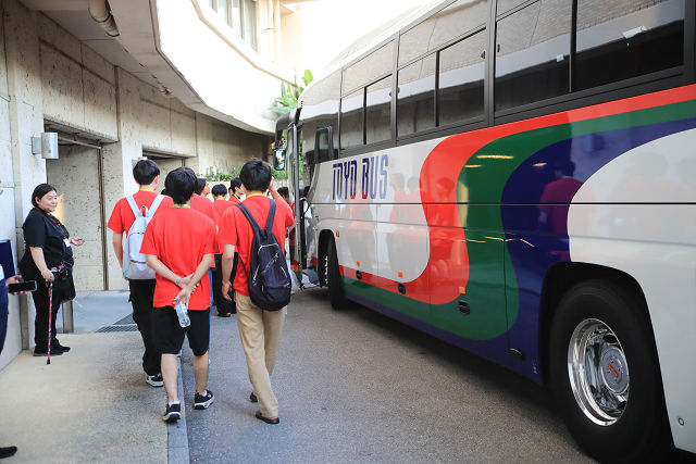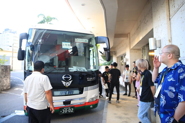 ついに始まった沖縄決勝大会。参加の22チームは朝7時に集合してバスに乗り込み、いざ実技会場のサンシャインNEXT宜野湾店へ!