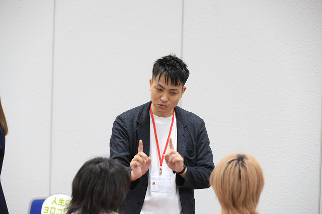 この日集まったのは約170名の学生・第二新卒やフリーター。5月に開催された超アミュジョブサミットの時より広い会場でしたが来場者・出展企業も多いため、瞬く間に人で溢れました。冒頭、須永氏があいさつと説明を行い、開始早々、各ブースには多くの学生が集まりました。