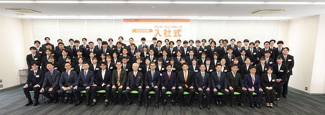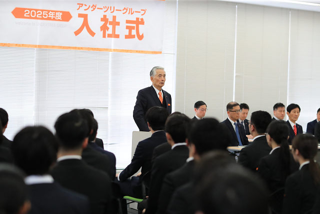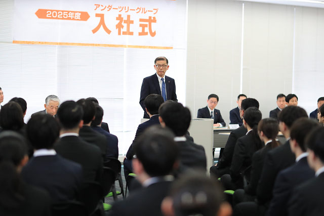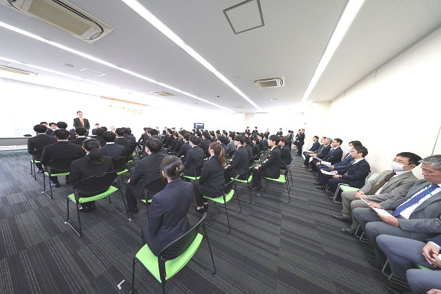 入社式では、2025年採用の新入社員79名(男性:55名/女性:24名)、役員、幹部、人事部が集まり、木下 春雄代表取締役会長、続いて松浦 信一郎代表取締役社長の訓示を受けました。