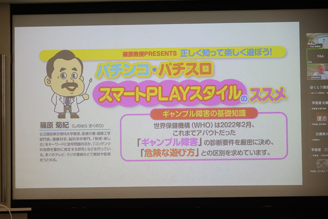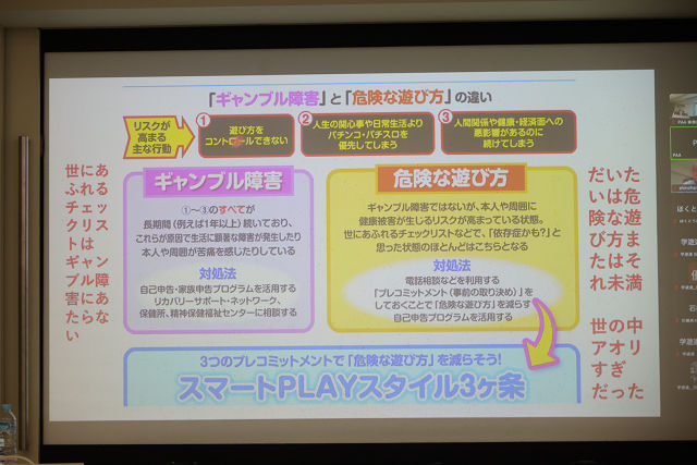 さらに、表題の「依存予防」についてもプレイする時間、投資する金額、自己管理、周囲に隠さない等のルールを設けた遊技行動が、「危険な遊び方」の抑止にも有効であると言及され、「“遊び方”のコントロールが重要」とお話されていました。