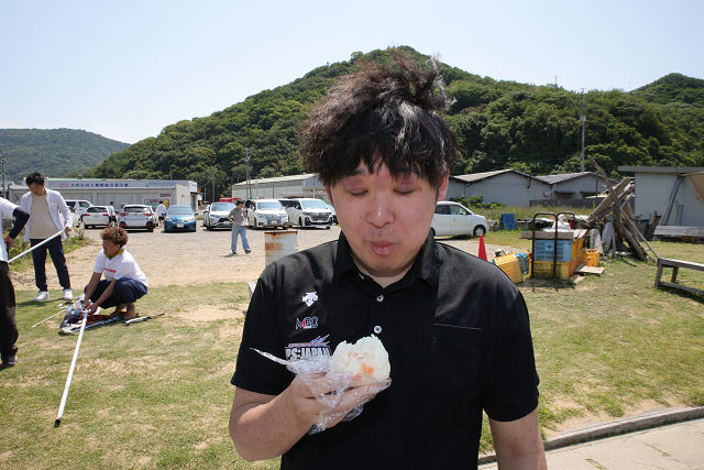 平山理事長が用意してくれた、おにぎりの差し入れを頬張る有村くん