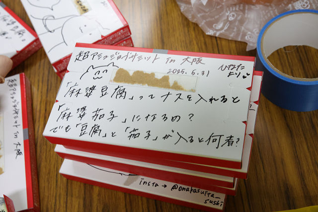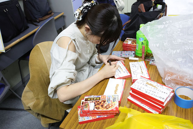 会場での学生との会話やフォローの合間に、懇親会用のプレゼント一つひとつ異なるメッセージ入りサインを書いていました。