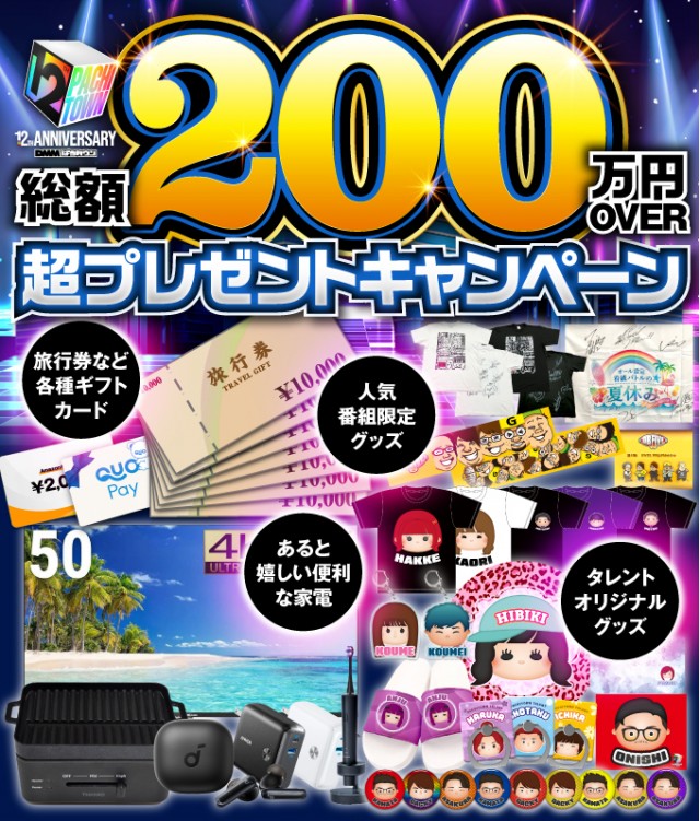 総額200万円OVERの12周年超プレゼントキャンペーンで豪華賞品をゲットしよう!!