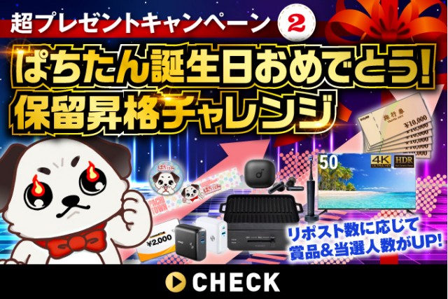 8月8日はDMMぱちタウン公式マスコットキャラクター「ぱちたん」の誕生日でもあります。というわけで、対象ポストのリポストが一定数に達すると保留が昇格していくキャンペーンをやっちゃいます!