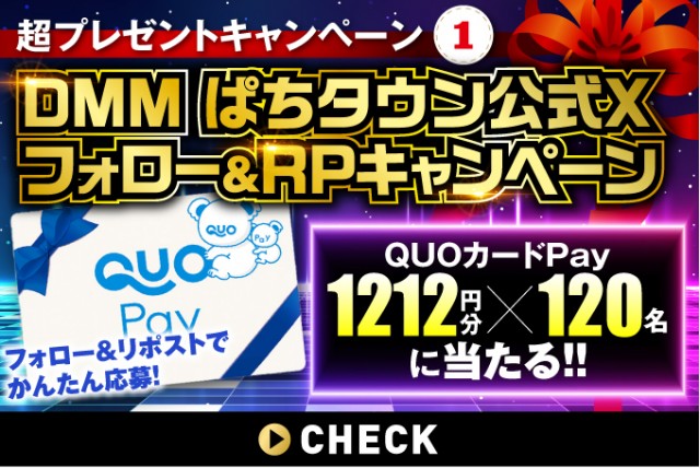 DMMぱちタウンの公式Xをフォロー&RPすることで参加できるキャンペーン。1212円分のQUOカードPayが120名様に当たります!