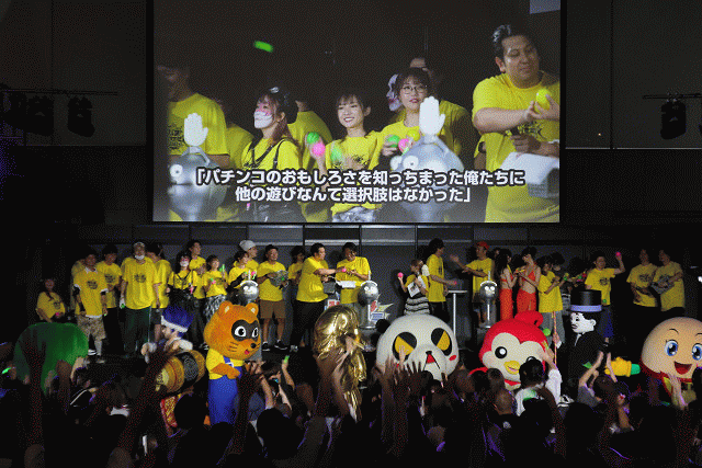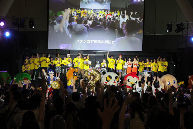 ステージ終盤では、山本裕典さんがDJとして、パチンコ・パチスロミュージックのオリジナルアレンジMIX曲を流し、会場内では色とりどりのサイリウムが舞い踊り、外気以上の熱気に満ちました。クライマックスには、各メーカーのイメージキャラクターも一同に勢ぞろいして大興奮の渦に包まれて幕を引きました。