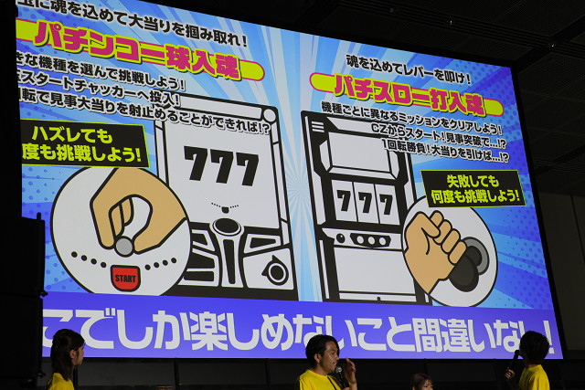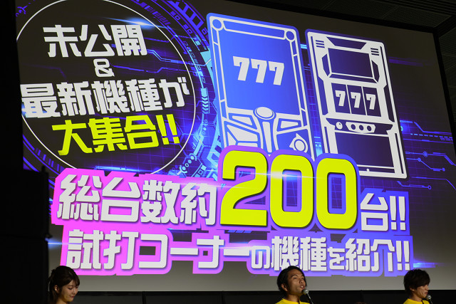 パチスロメーカー29社、パチンコメーカー22社(ぱちんこ・パチスロ重複メーカー有)が一挙に勢ぞろい!合同開催は実に23年ぶりで、冒頭パチスロメーカーの組合である日本電動式遊技機工業協同組合(略称:日電協)の小林友也理事長、パチンコメーカーの団体である日本遊技機工業組合(略称:日工組)の盧昇副理事長が挨拶されました。