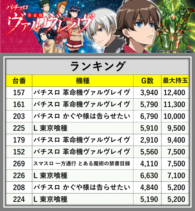 東リベ、喰種いつも通り稼働よかった!北斗も初当たり良さそうなのありました。かぐや様から万枚1台!あとはクレアがいい感じ。まだ打ってないから今度家の近くで打ってみたい。