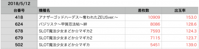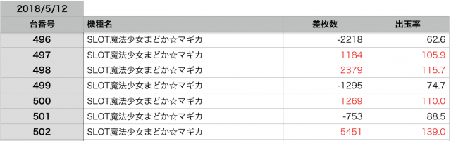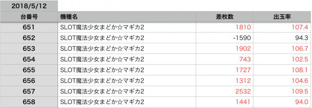 『SLOT魔法少女まどか☆マギカ』ですが、5000枚オーバーをはじめ差枚数プラスが多く、今回は合わせて投入してきている可能性もあります。