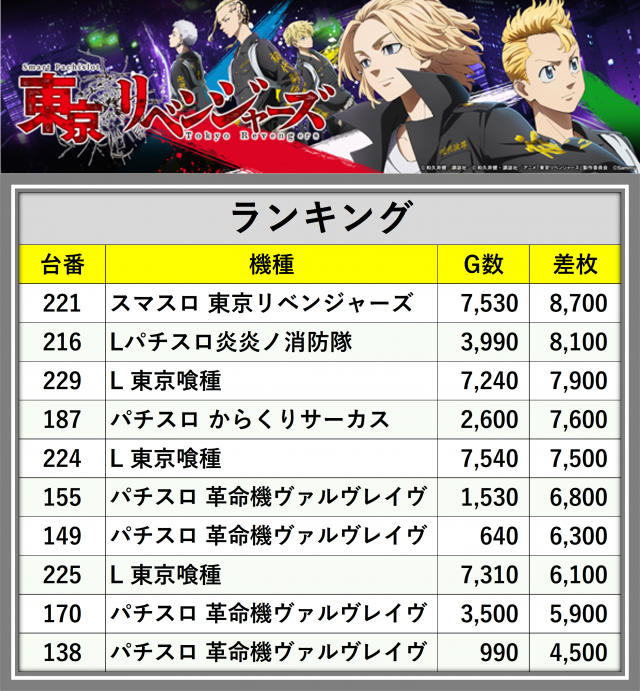 ※差枚数順に掲載しています