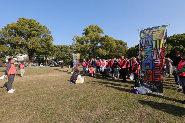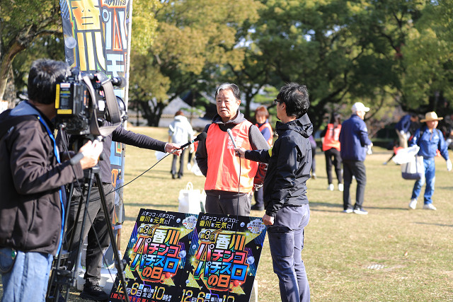香川県パチンコ・パチスロの日の、のぼりや看板も掲げられ、香川県遊協の秦 孝広専務理事が挨拶と説明を行い、平山 剛理事長の挨拶の後に清掃活動が開始されました。